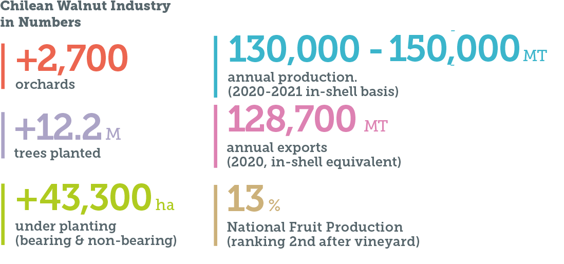 At the same time, technical aspects such as: irrigation; plantation density; pruning; pest, weed and disease control; and, above all, meeting the quality standard of international demand, were finetuned, opening the door for the supply of high-quality walnut that currently Chile offers to the world[2].