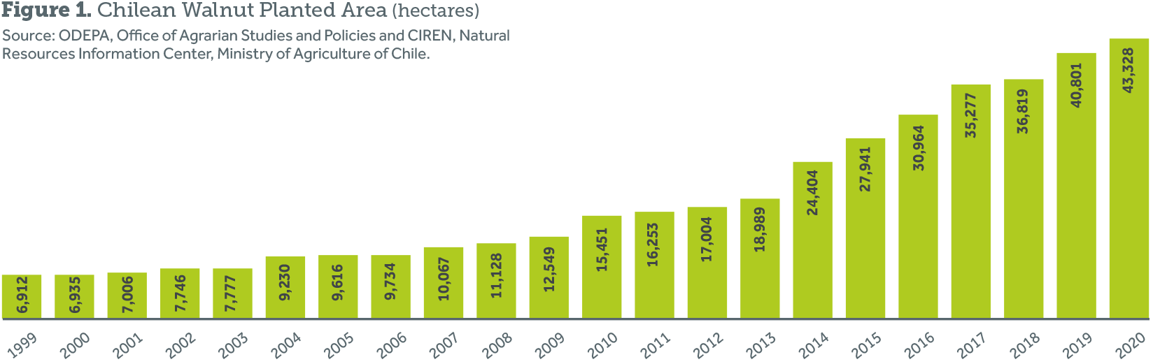 Since the late 1970s, with around 4,000 hectares of seed walnut trees and a productivity of less than one metric ton per hectare, Chilean walnut production has grown to over 43,300 ha planted (Figure 1) with grafted trees. National average productivity is estimated at 4.5 MT/ha (weighted based on planted area per region), and with adult orchards yielding up to 8 to 11 MT/ha as stable production, which are among the highest yields in the industry. There are 2,775 reported orchards growing walnuts and weighted average tree density is at 267 trees/ha. Currently accounting for 13% of the national fruit planted area, walnut is the second most cultivated fruit in the country, after grapevine[2,3].