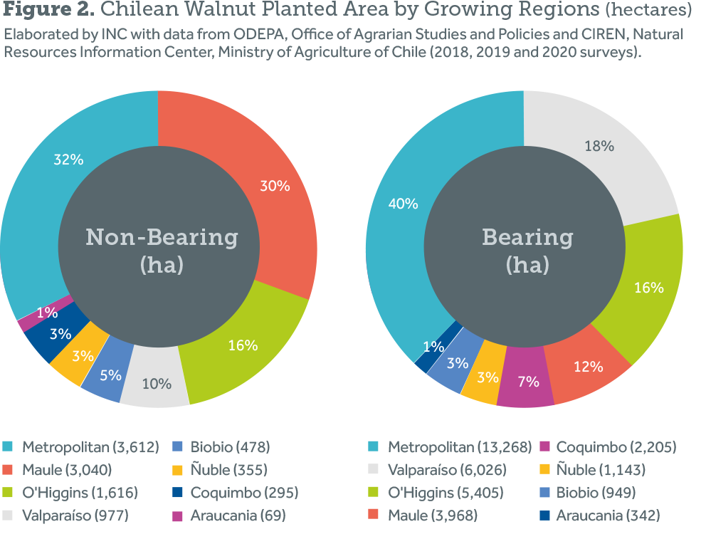 According to the latest ODEPA-CIREN census, the Metropolitan (Santiago) region accounts for 38% of the walnut planted area, followed by O’Higgins, Maule and Valparaíso with 16% each. The remaining 13% is distributed among Coquimbo (6%), Ñuble (3%), Biobío (3%) and Araucanía (1%). Non-significant hectarage in Atacama, Ríos and Lagos complete the total of 43,328 ha of walnut planted area in the country, including non-bearing (23%) and bearing (77%) hectarage (Figure 2). Regarding varieties, 78% of the overall growing area is planted with Chandler, followed by Serr with 19%. Howard, Cisco and other 23 different varieties account for the remaining 3%.