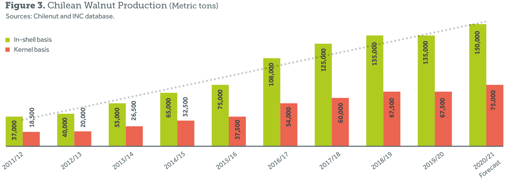 Over the last 10 years, total production has grown at an average annual rate of 14,000 metric tons (in-shell basis) and it is currently estimated at 135,000 MT (in-shell basis)/67,500 MT (kernel basis). A severe drought in the main walnut production area has affected the 2019/20 crop and is expected to slightly reduce the 2020/21 results as well. All in all, as per Chilenut expectations, 2020/21 crop is likely to hit the 150,000 MT threshold (Figure 3) and to reach between 225,000 250,000 MT by 2030.