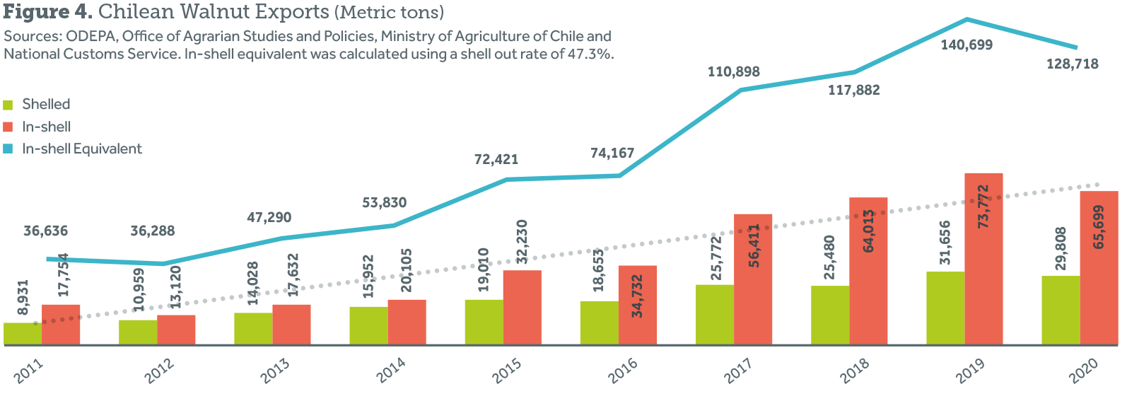 As reported at the ODEPA international trade database, total exports in 2020 added up to 128,700 MT in-shell equivalent, up by 251% compared to 2011. Both in-shell (HS code 080231) and shelled (HS codes 08023210 and 08023290, wholes and halves respectively) overseas shipments have trended positively over the last decade. Shelled exports increased 3.3 times between 2011 and 2020 at an annual average rate of 1,900 MT/year. In-shell exported volumes grew 3.7 times over the same period at a rate of 7,300 MT/year (Figure 4).