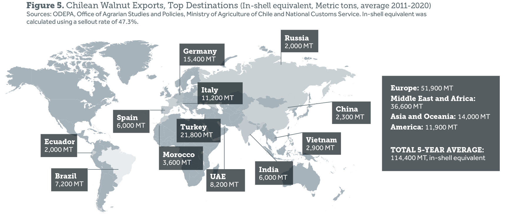Led by Germany, Italy and Spain, and accounting for 45% of the origin’s share, Europe is the main destination for Chilean walnuts (in-shell equivalent, 5-year average 2016-2020). Middle East and Africa add up to the following 32%, being Turkey, UAE and Morocco the top buyers (Figure 5).
