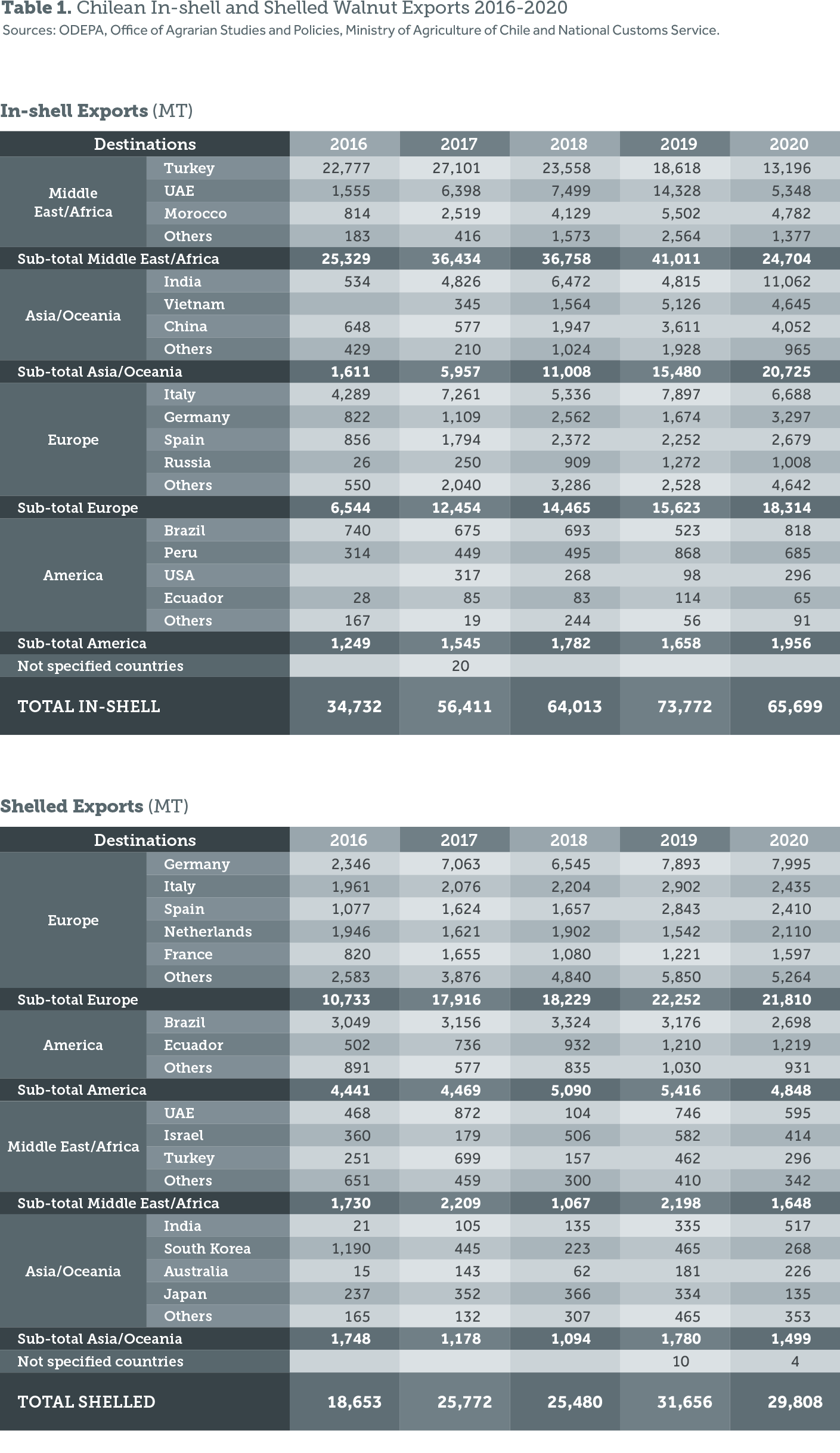 Shipments of shelled walnuts doubled up between 2016 and 2020 and are mainly absorbed by Western Europe. Brazil is the biggest importer in America, while Ecuador seems to be an emerging destination (Table 1).